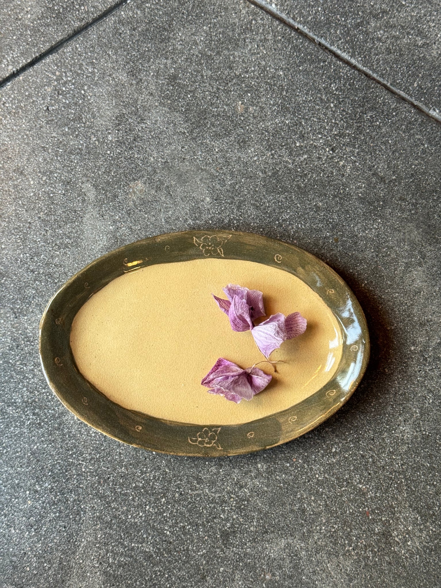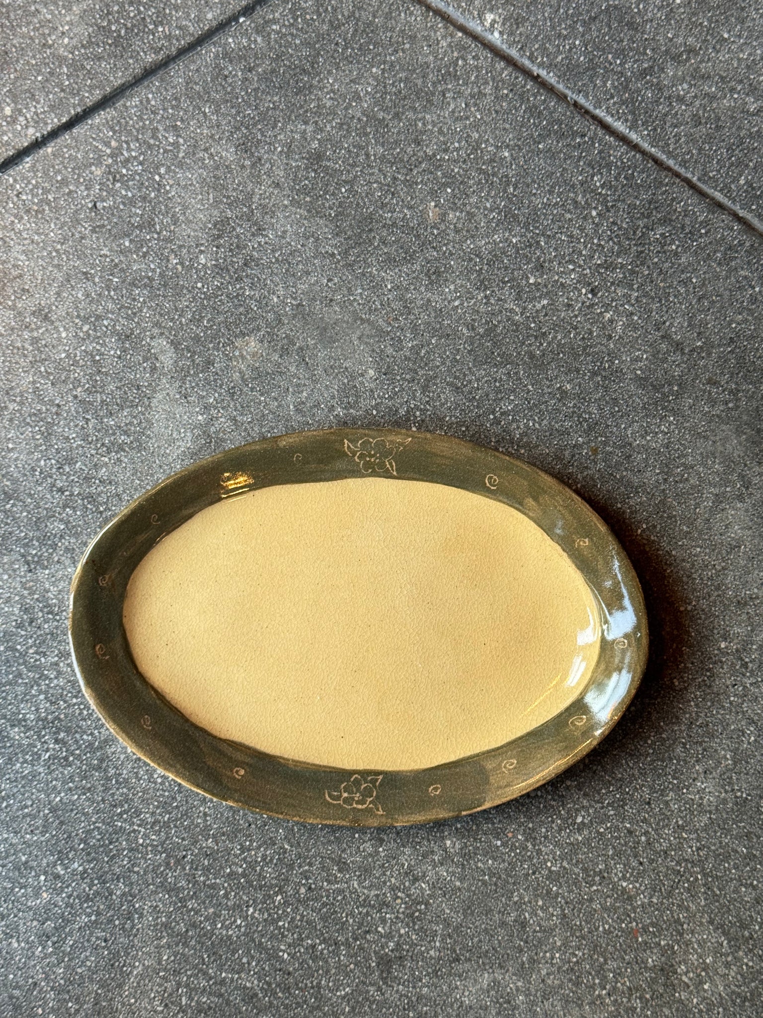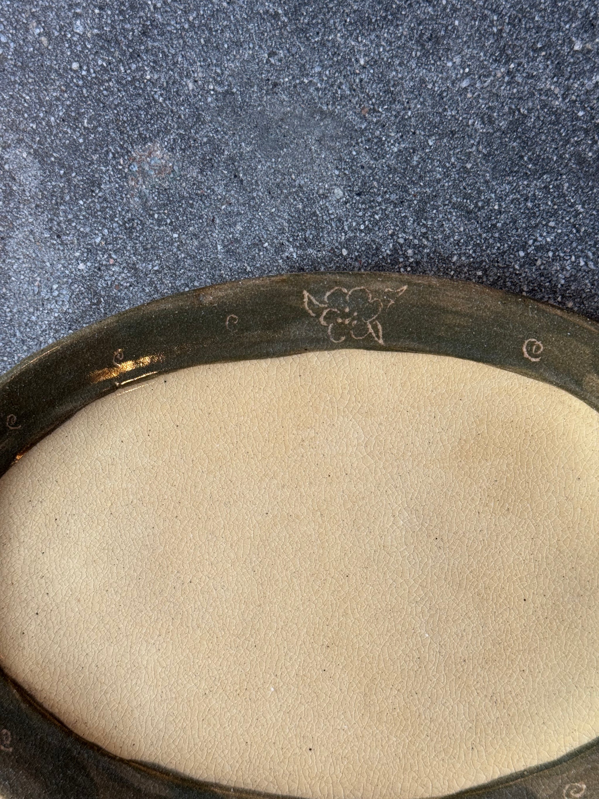 Green paint on rim, light sgraffito work to expose image. Natural clay color exposed in center.