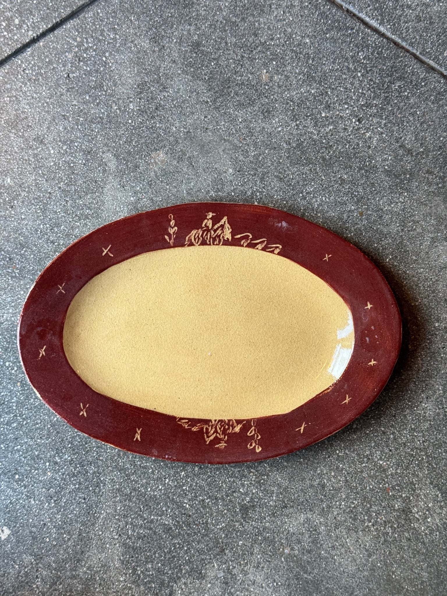 Hand painted details along the rim, natural clay color in the center. Light sgraffito work on the rim to bring the image alive.