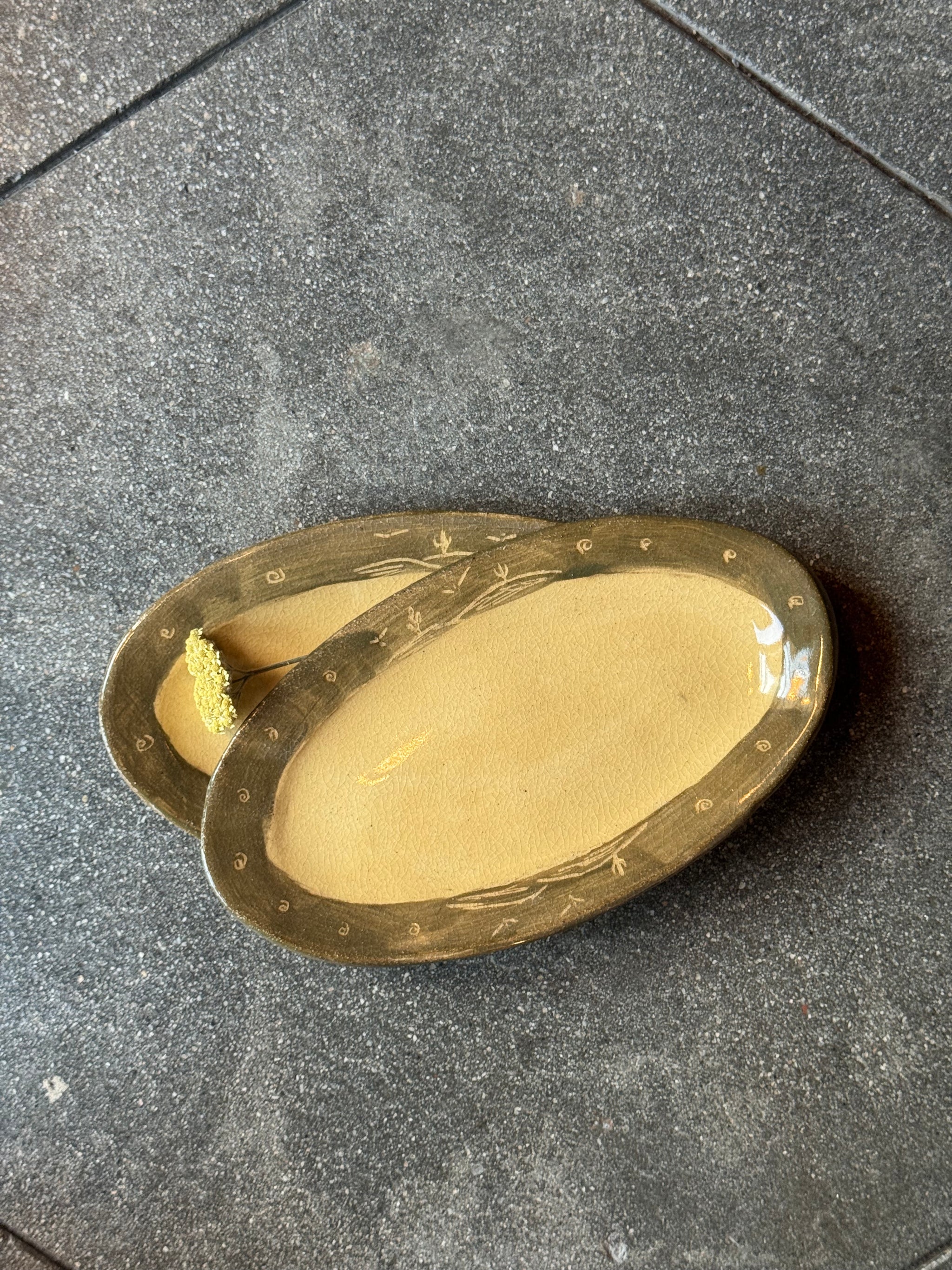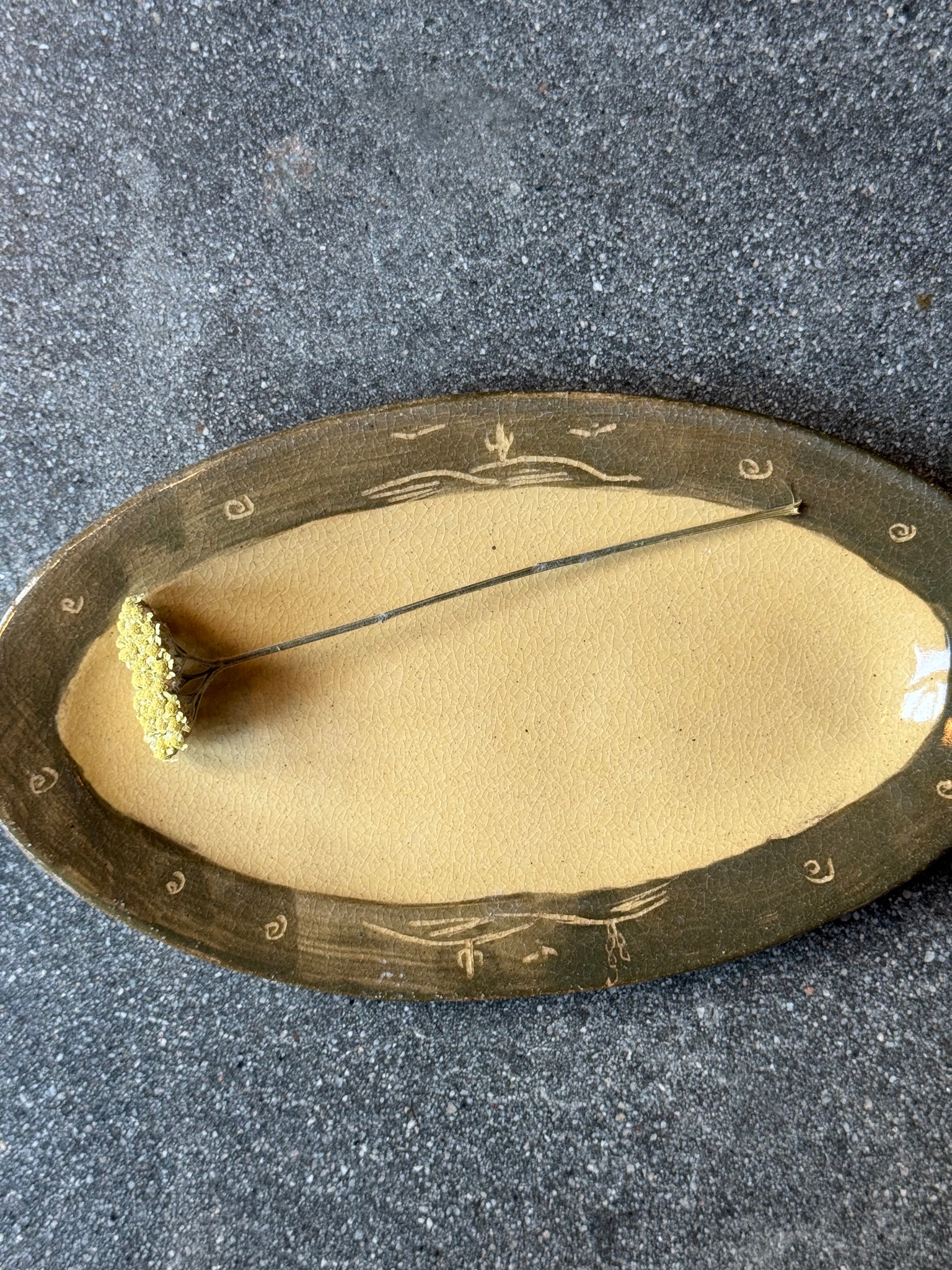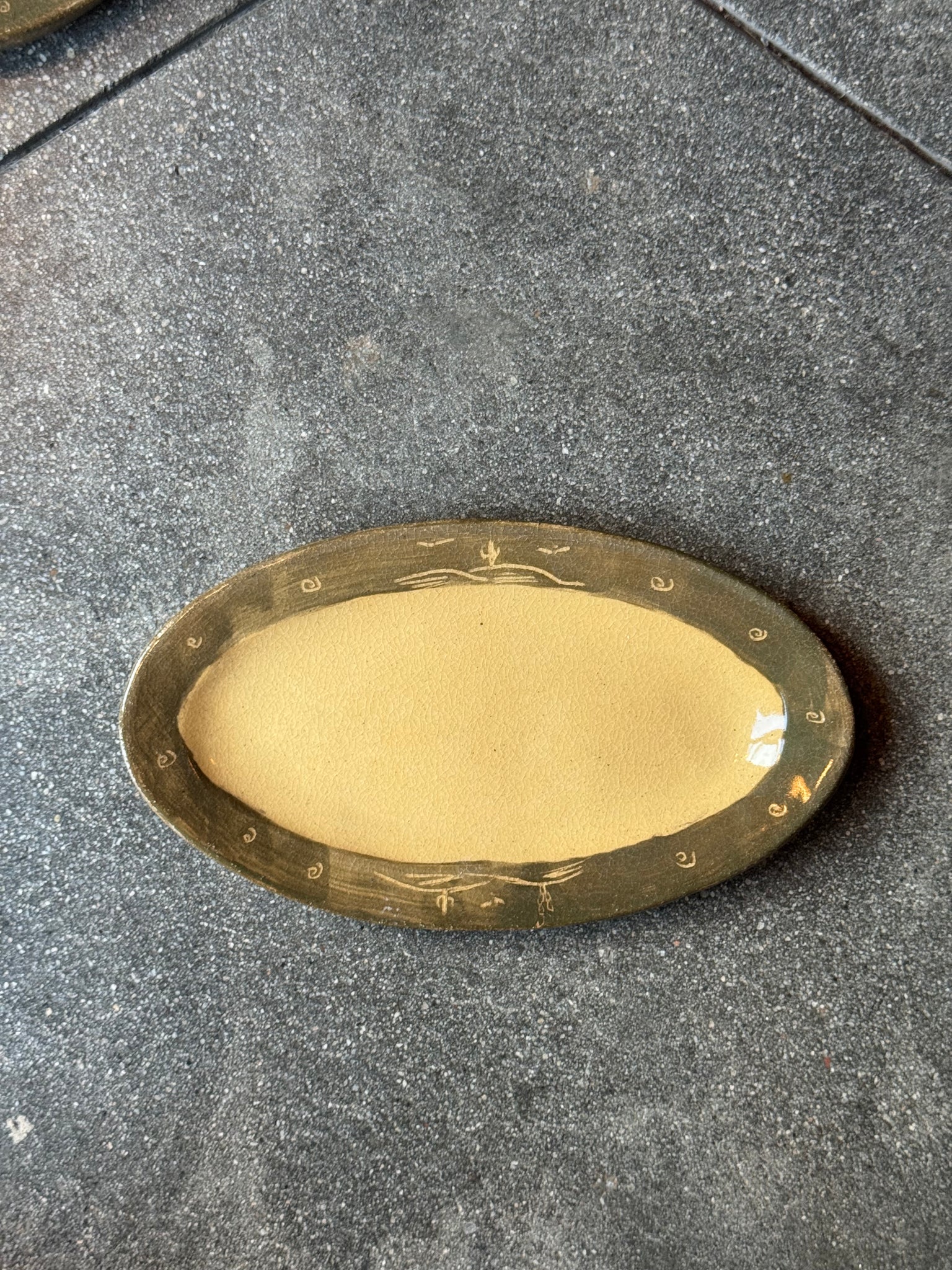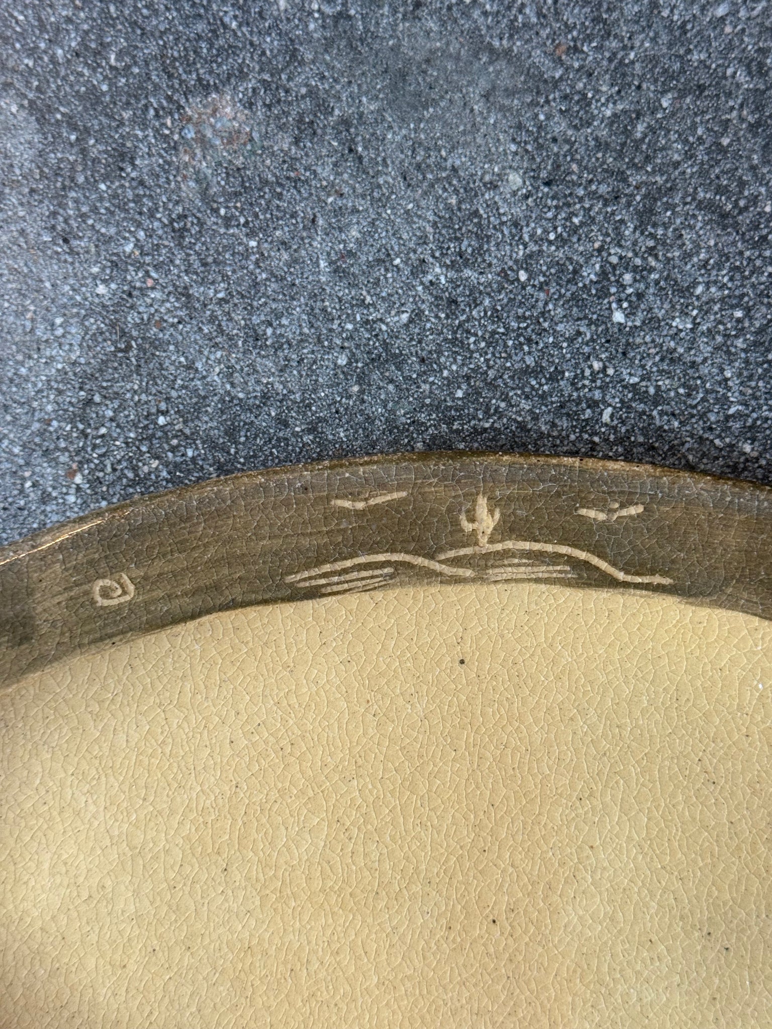 Color : faded green on the rim, natural clay exposed in the centre, light scraffito technique for illustration