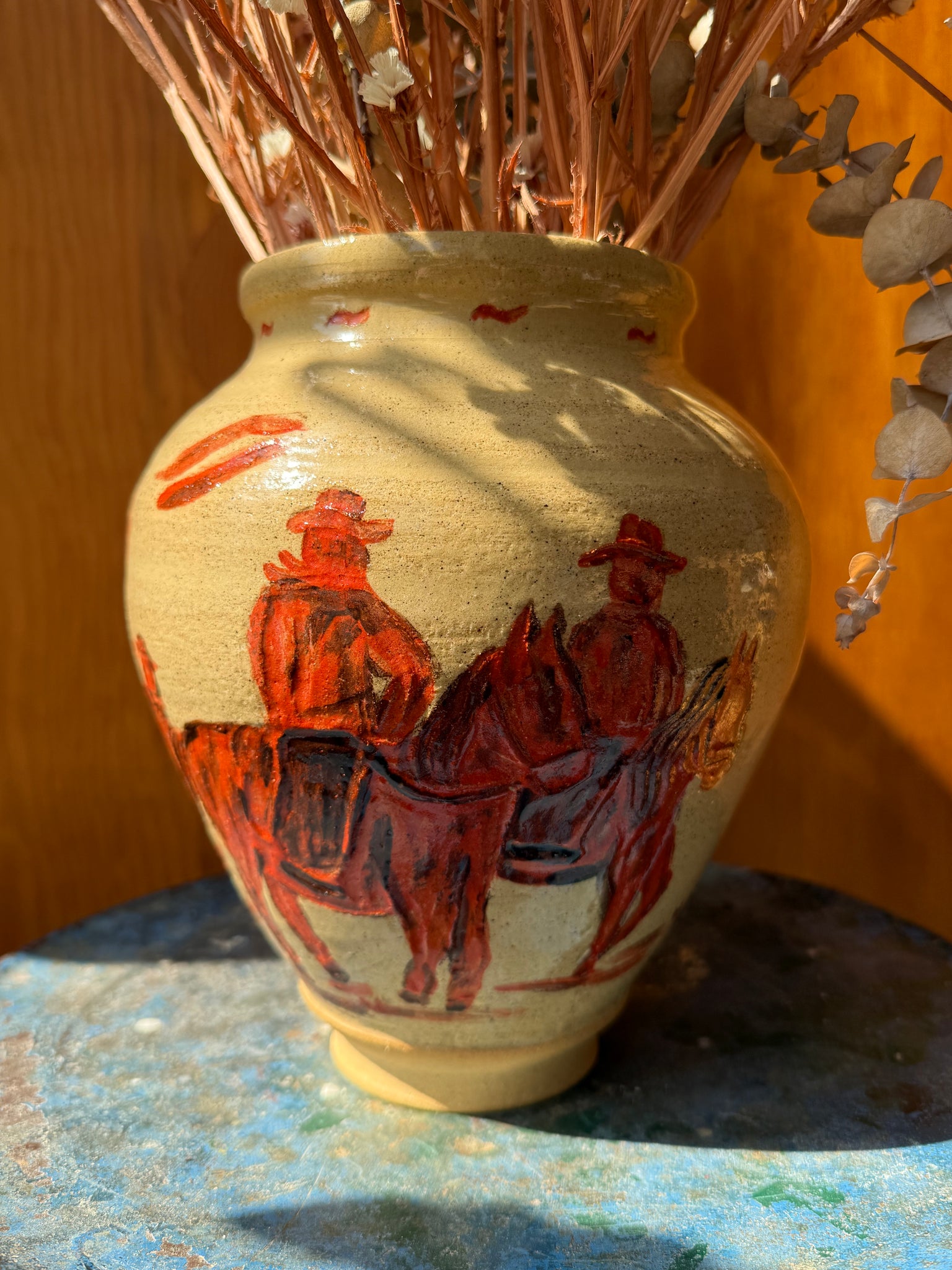 Yellow colored clay body, mostly porcelain with some speckles. Multiple colored carving and underglaze