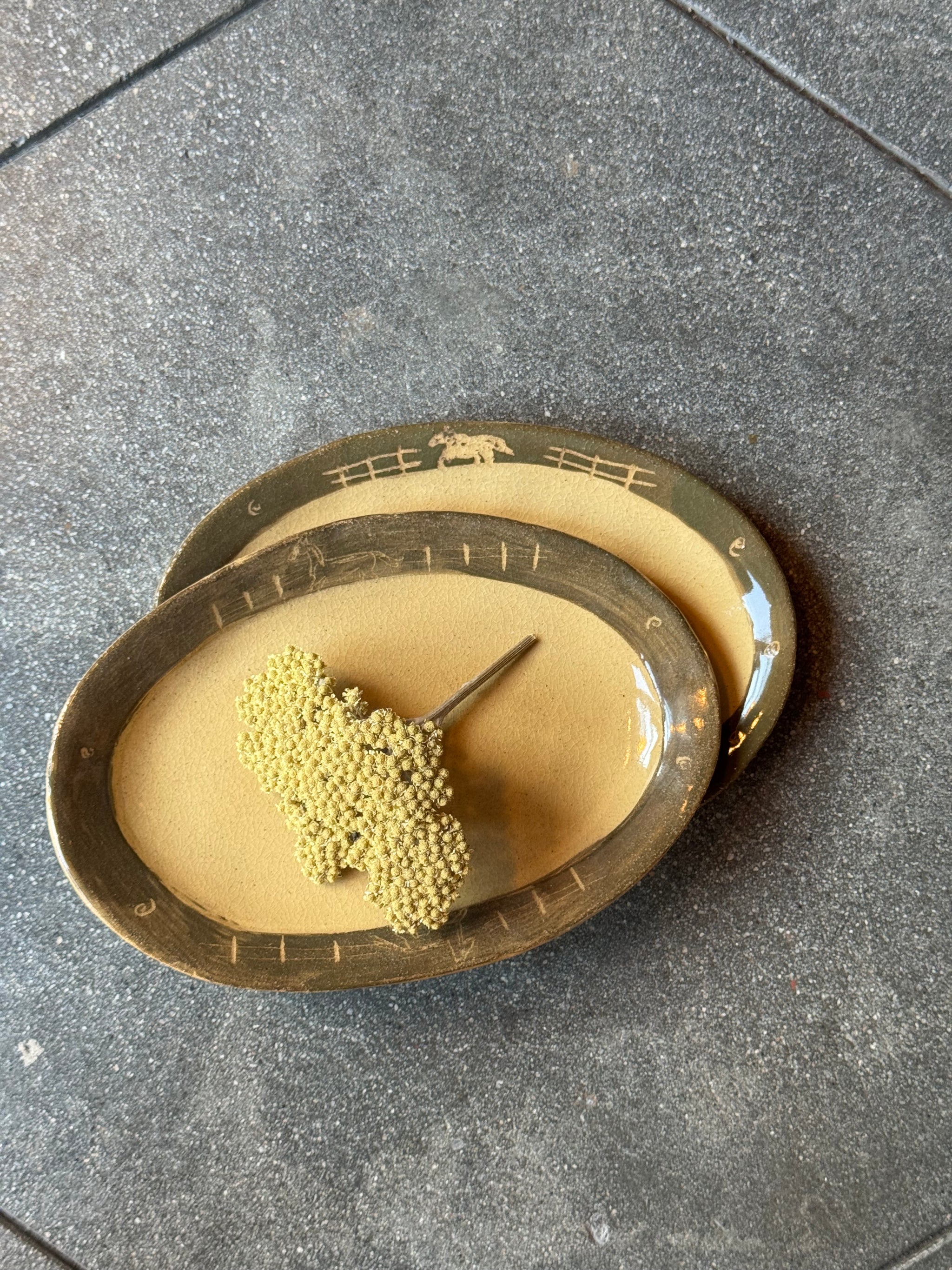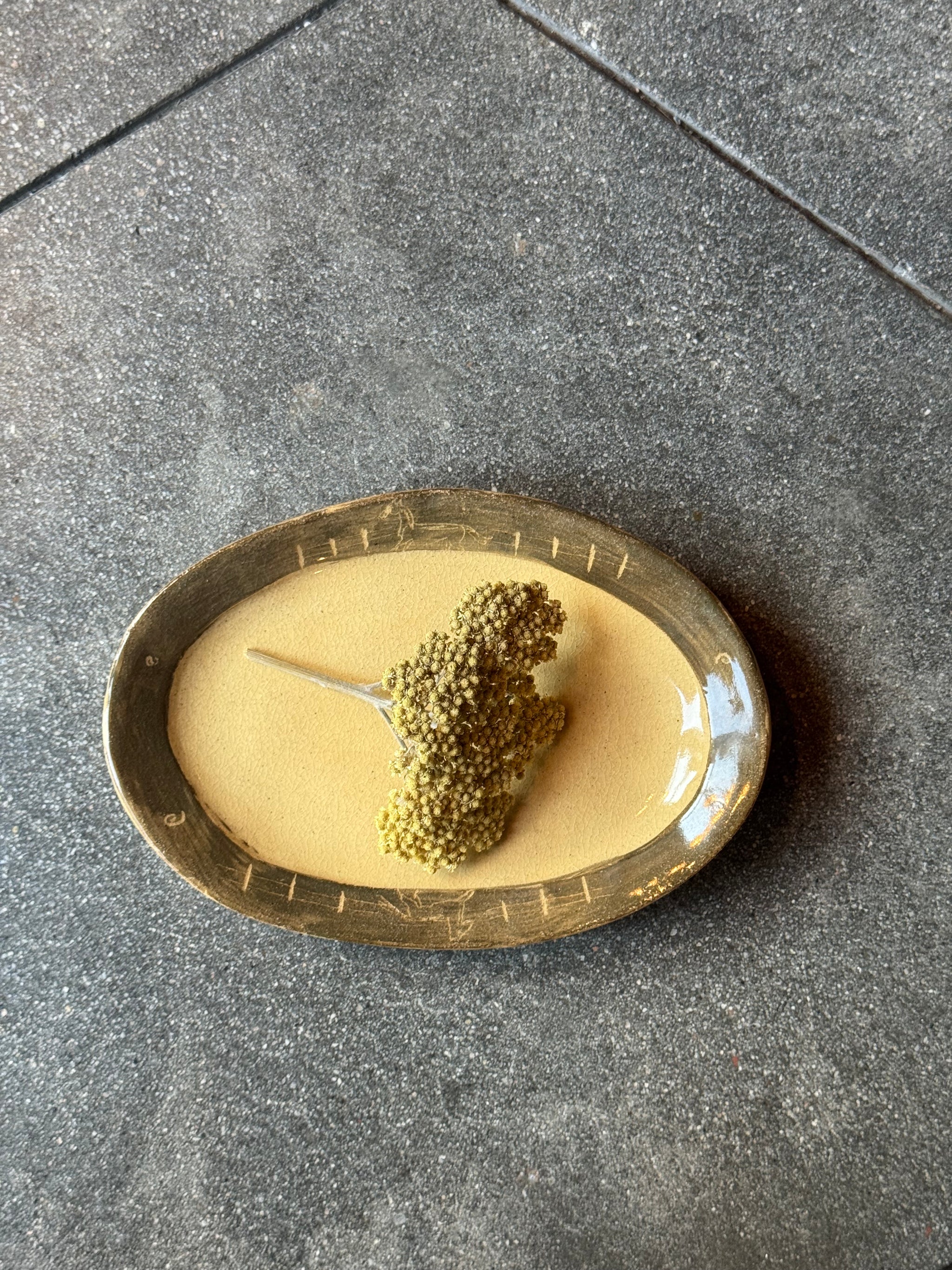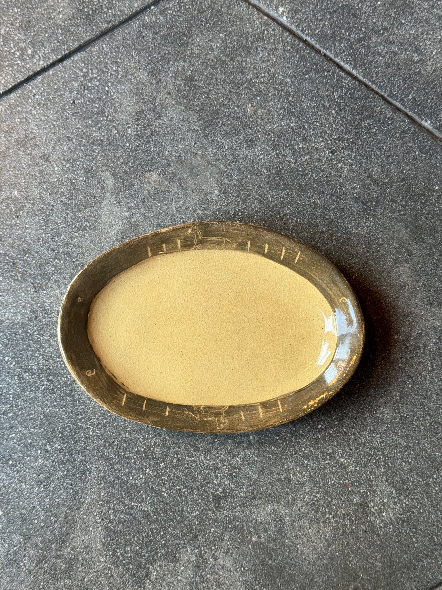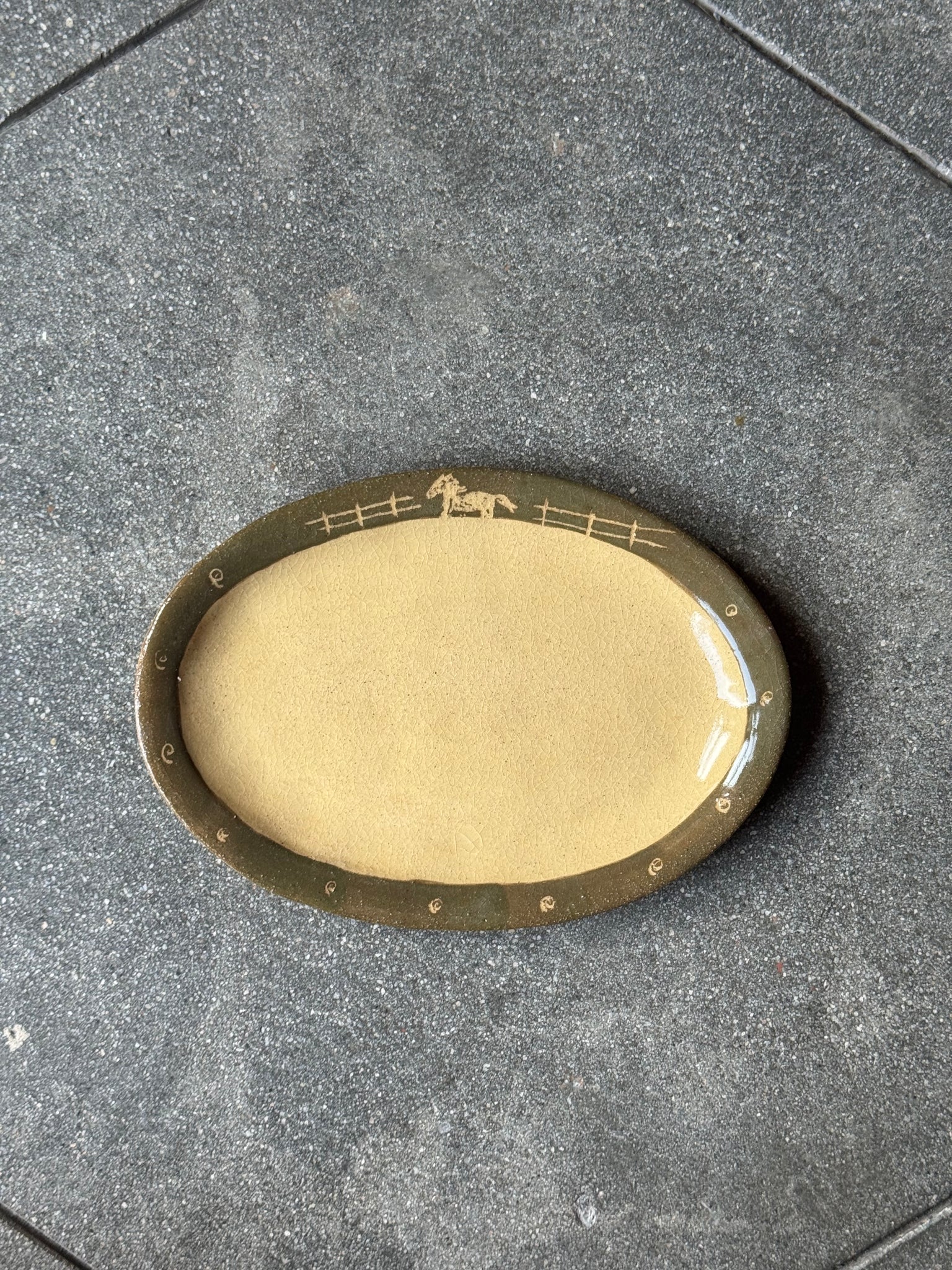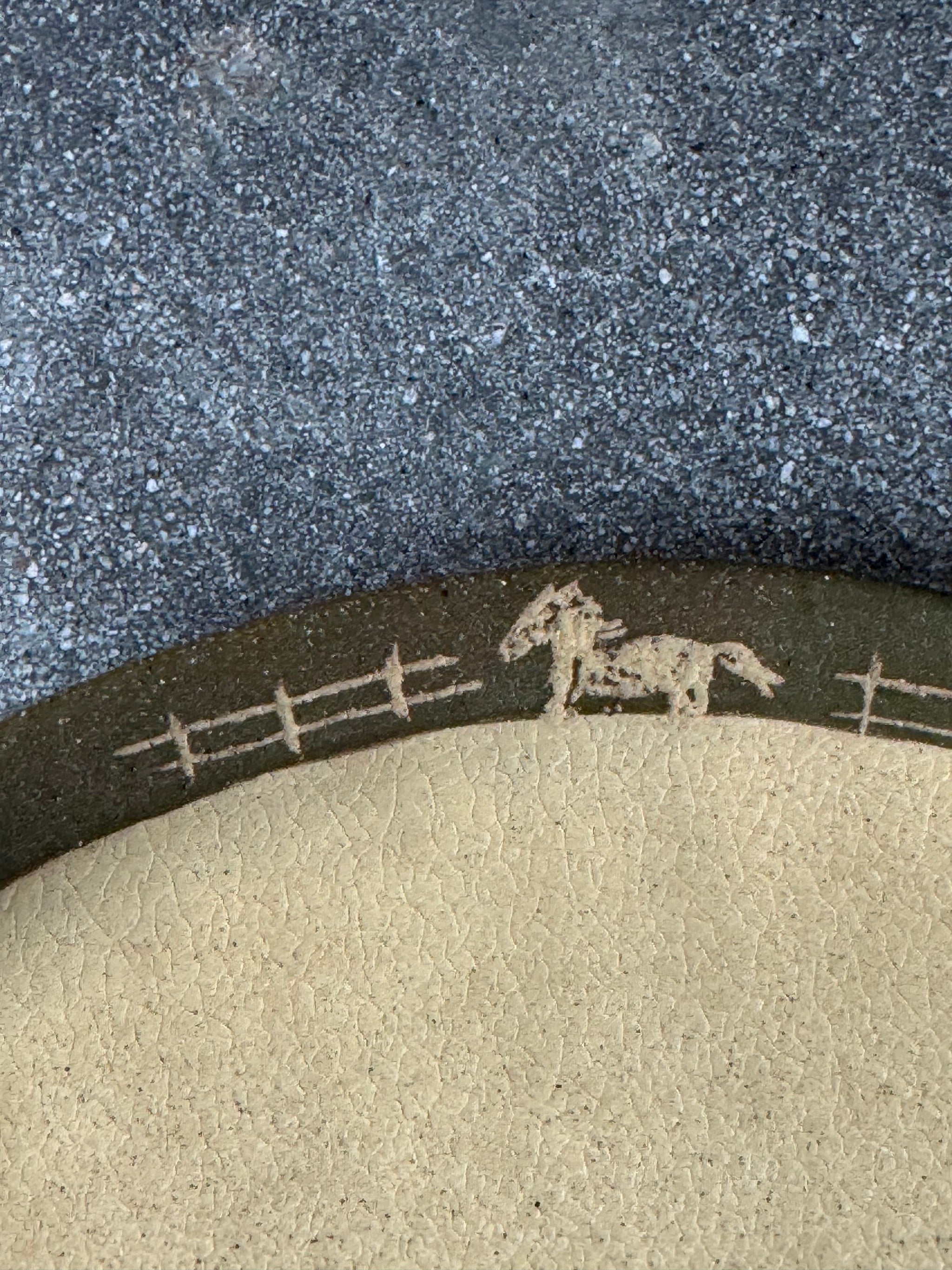 Green paint on rim, light sgraffito work to expose image. Natural clay color exposed in center.
